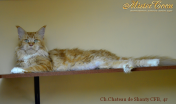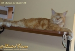 ICH Chateau de Shanty CFB (Соня) - очень крупная мэйн кун кошка с четко выраженными породными особенностями. Тело мускулистое, длинное и крупное, коробочка – «мейн куновская» с ярко-выраженными прямоугольными формами. Имеет шикарныы пушистый длинный хвост. Отличные крупные ушки, на кончиках которых расположились густые кисточки – настоящая домашняя рысь.