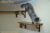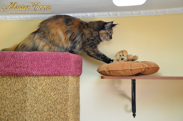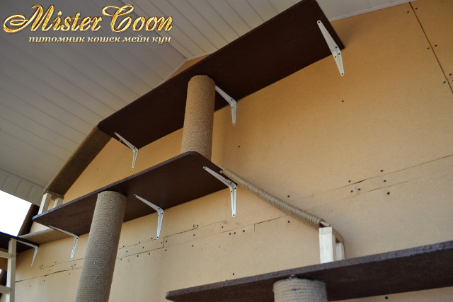 В таких хоромах котята мейн кунов растут в играх и забавах, но под постоянным присмотром своих мам и хозяев. Высокая двигательная активность обусловливает интенсивность и полноту кошачьего обмена веществ. Мейн куны, имеющие возможность бегать, прыгать и карабкаться (а не только лежать в ногах и гипнотизировать взглядом холодильник) всегда здоровы, сильны, смышлены.
